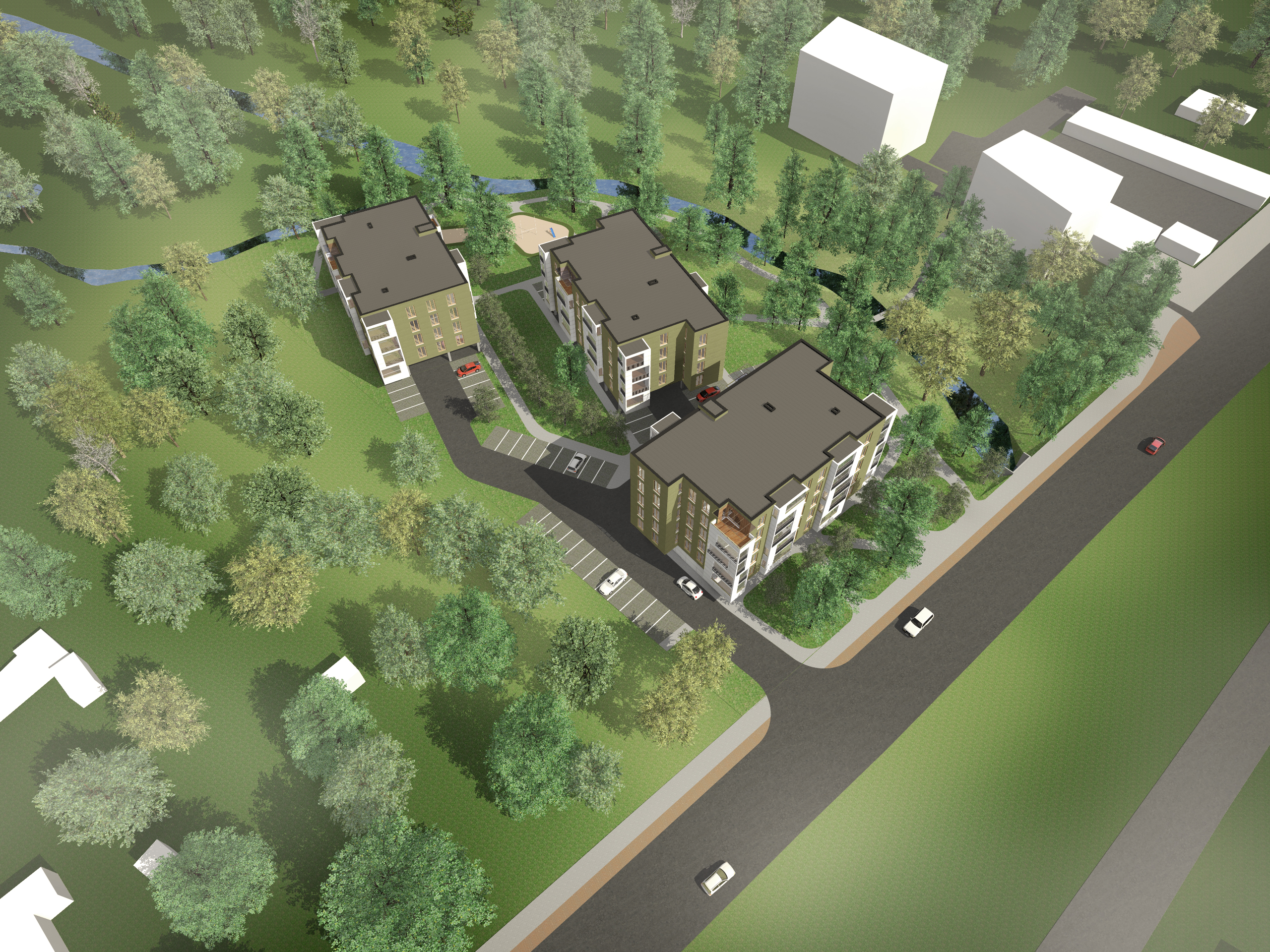 Kvartali üldiseks kujunduslikuks kontseptsiooniks on tervikliku hoonetegrupi loomine läbi ühtse hoonestustüpoloogia, arhitektuurse lahenduse ja viimistlusmaterjalide. Hoonete arhitektuurseks kontseptsiooniks on analoogse plaanilahendusega, ühe trepikojaga ja minimaalse üldkasutatava pinnaga korrusmajad. Korruse pind on maksimaalselt ära kasutatud kasuliku pinnana. Plaaniliseks kontseptsiooniks on korterite sidumine ümbritseva loodusliku keskkonnaga läbi avarate rõdude. Kõikide hoonete plaaniline kontseptsioon on analoogne, võimaldades vajadusel muuta plaanilahendust.