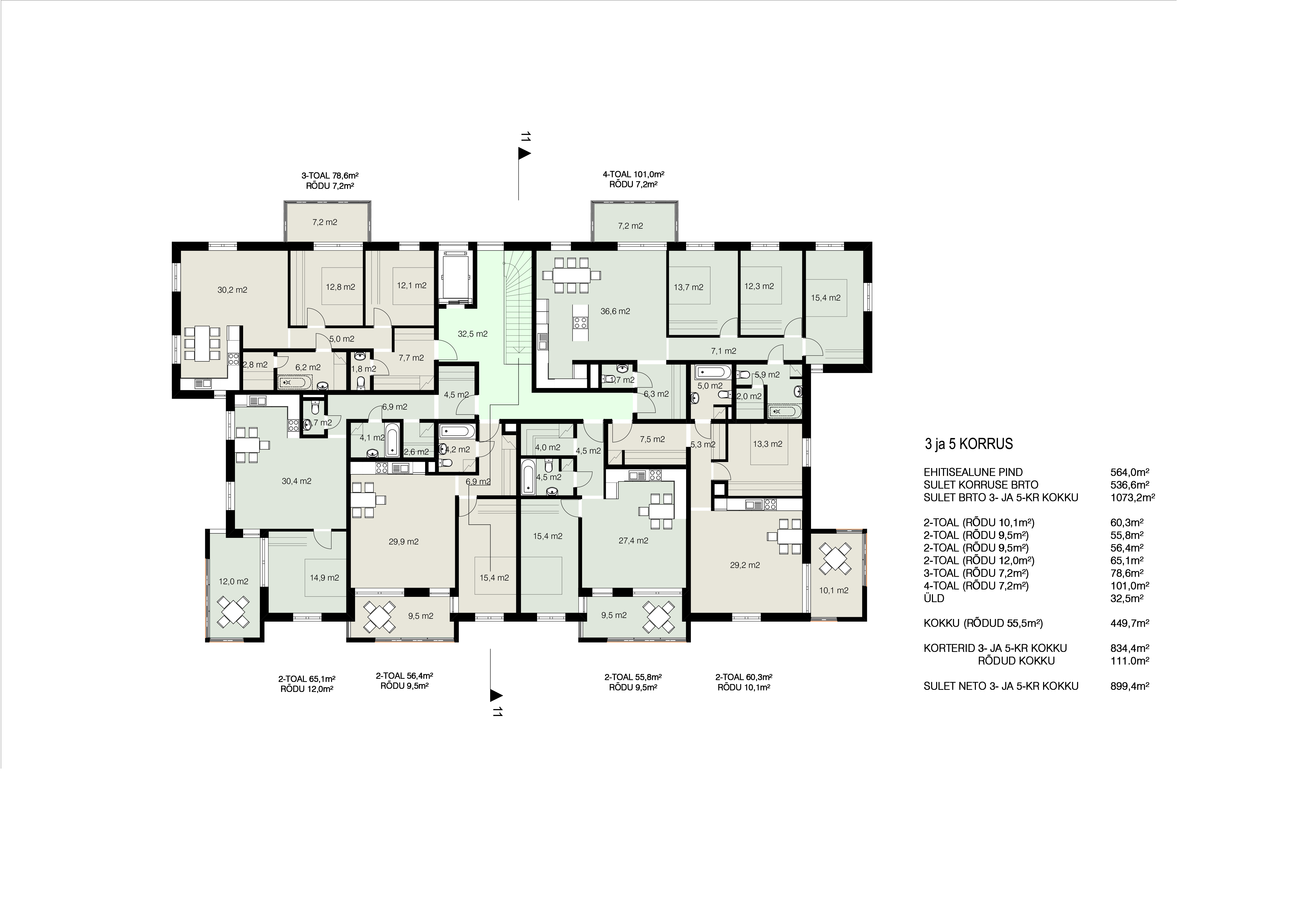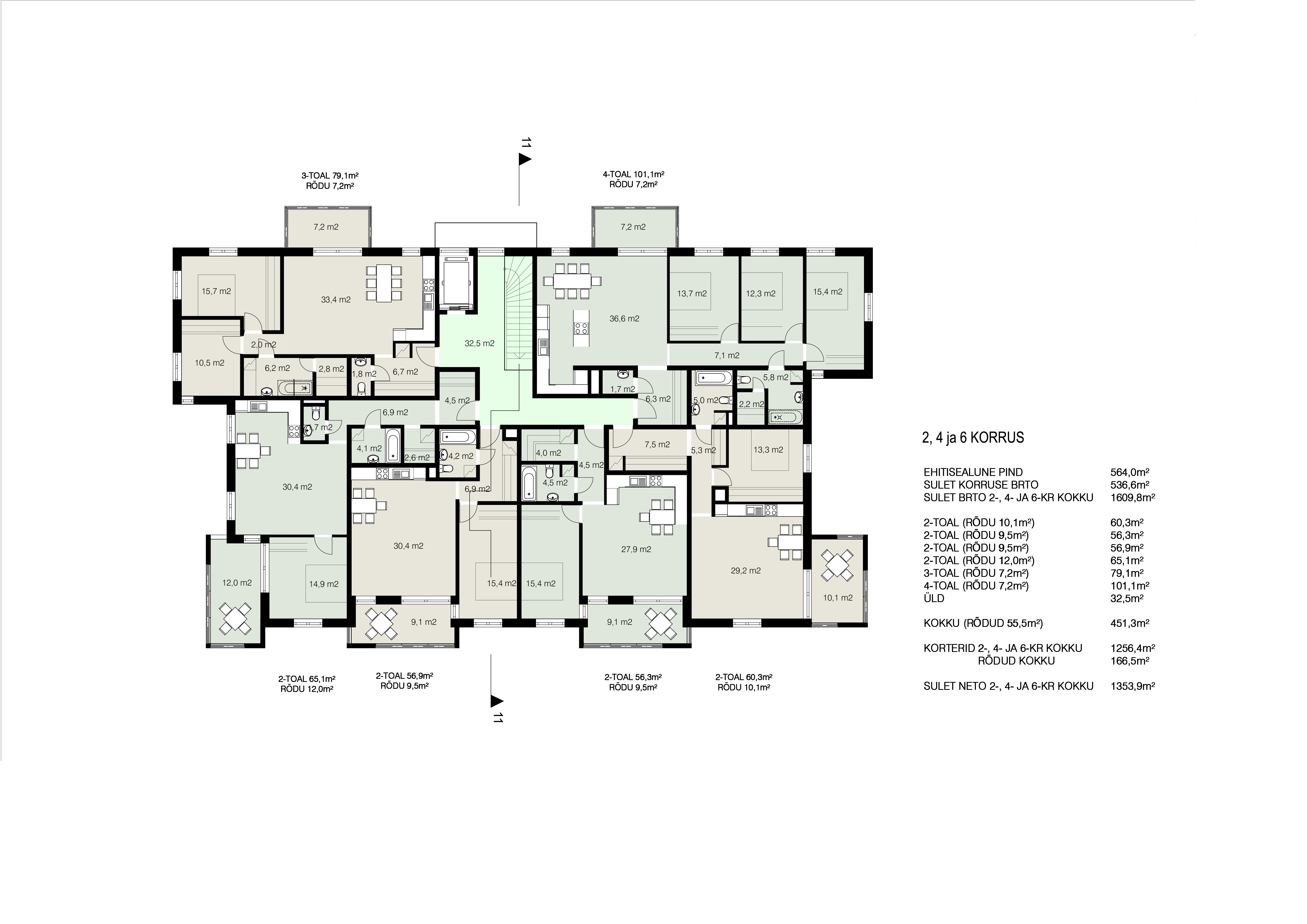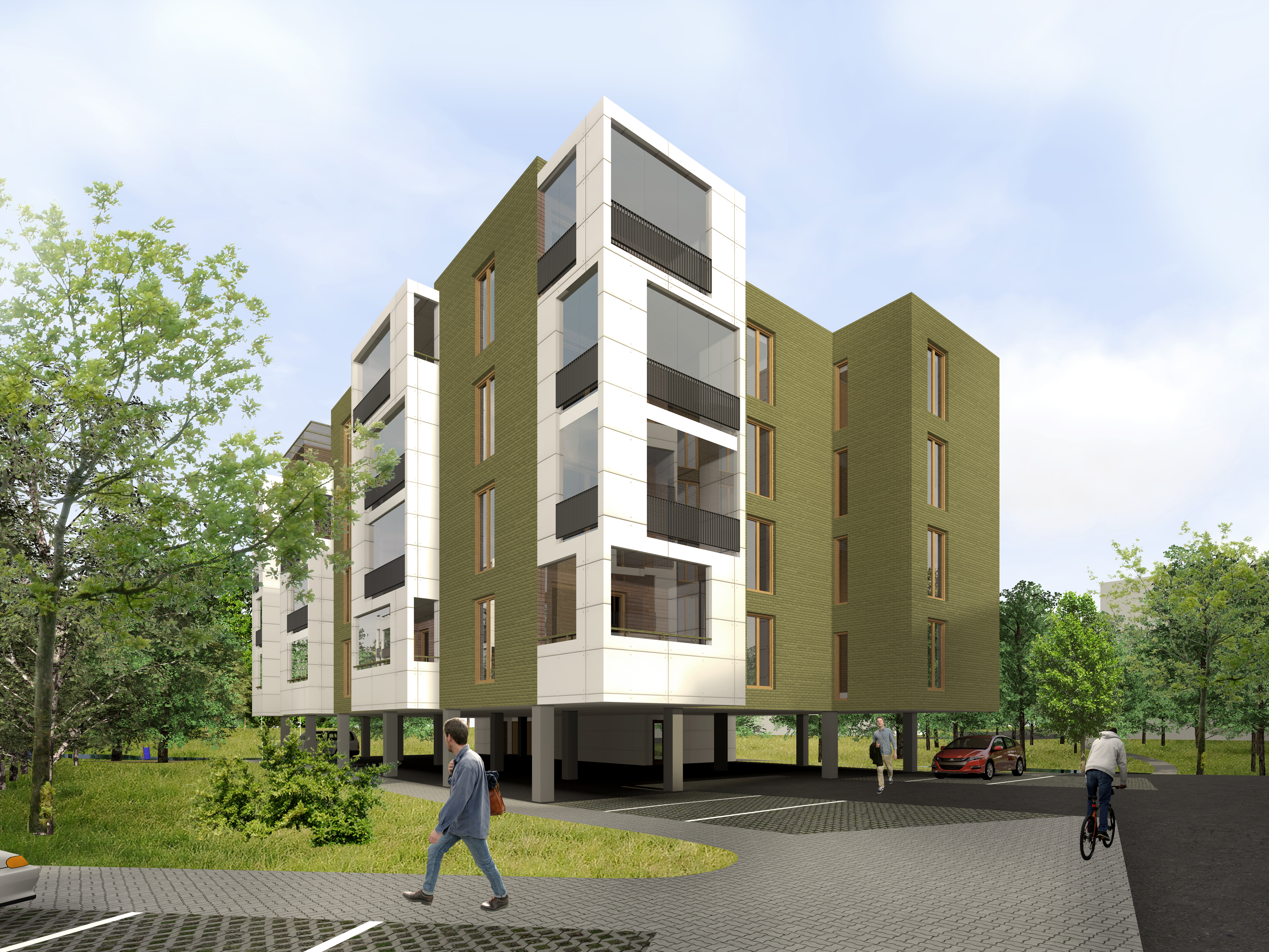 Alates teisest korrusest paiknevad kõikidel hoonetel korterid (2- … 4-toalised). Kõikidele korteritele on projekteeritud avarad kaetud rõdud (rõdude sügavus vähemalt 1,5m), mis loovad siseruumile ülemineku poolavatud välisruumi, tagades sise- ja välisruumi omavahelise seose.
