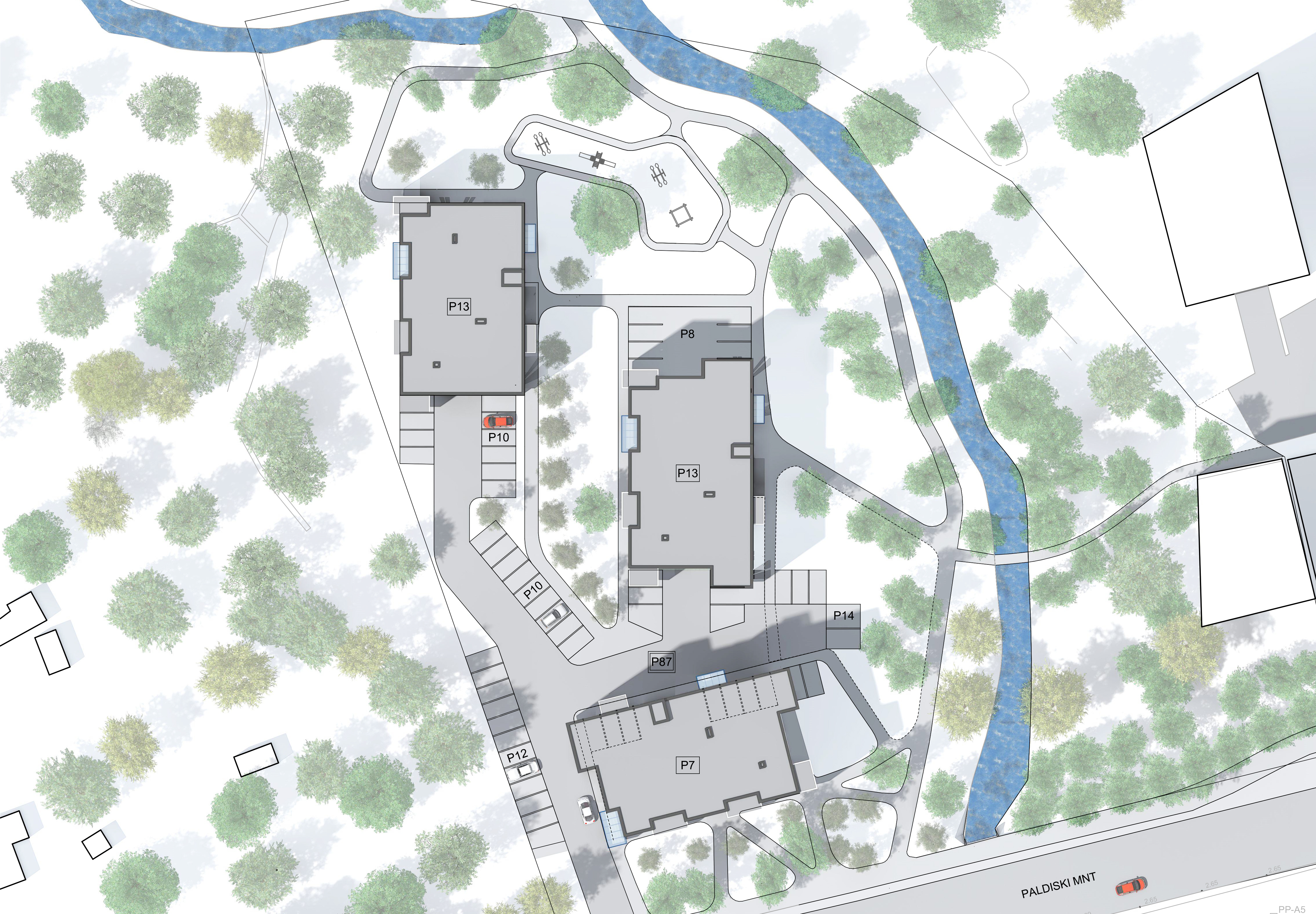 Asendiplaaniliseks kontseptsiooniks on loodusliku kõrghaljastuse säilitamine ning projekteeritud hoonestuse ja teede-juurdepääsude sidumine olemasoleva loodusliku keskkonnaga s.h. Mustjõe oja läänekaldal paiknevasse ehituskeeluvööndisse kujuneva pargialaga. Asendiplaaniline lahendus loob maksimaalse seose olemasoleva loodusega ning tagab hea kergliikluse ühenduse Kopli lahe rannaalaga, Tallinna ühe tihedama liiklusega põhimagistraali, Paldiski maantee ääres.